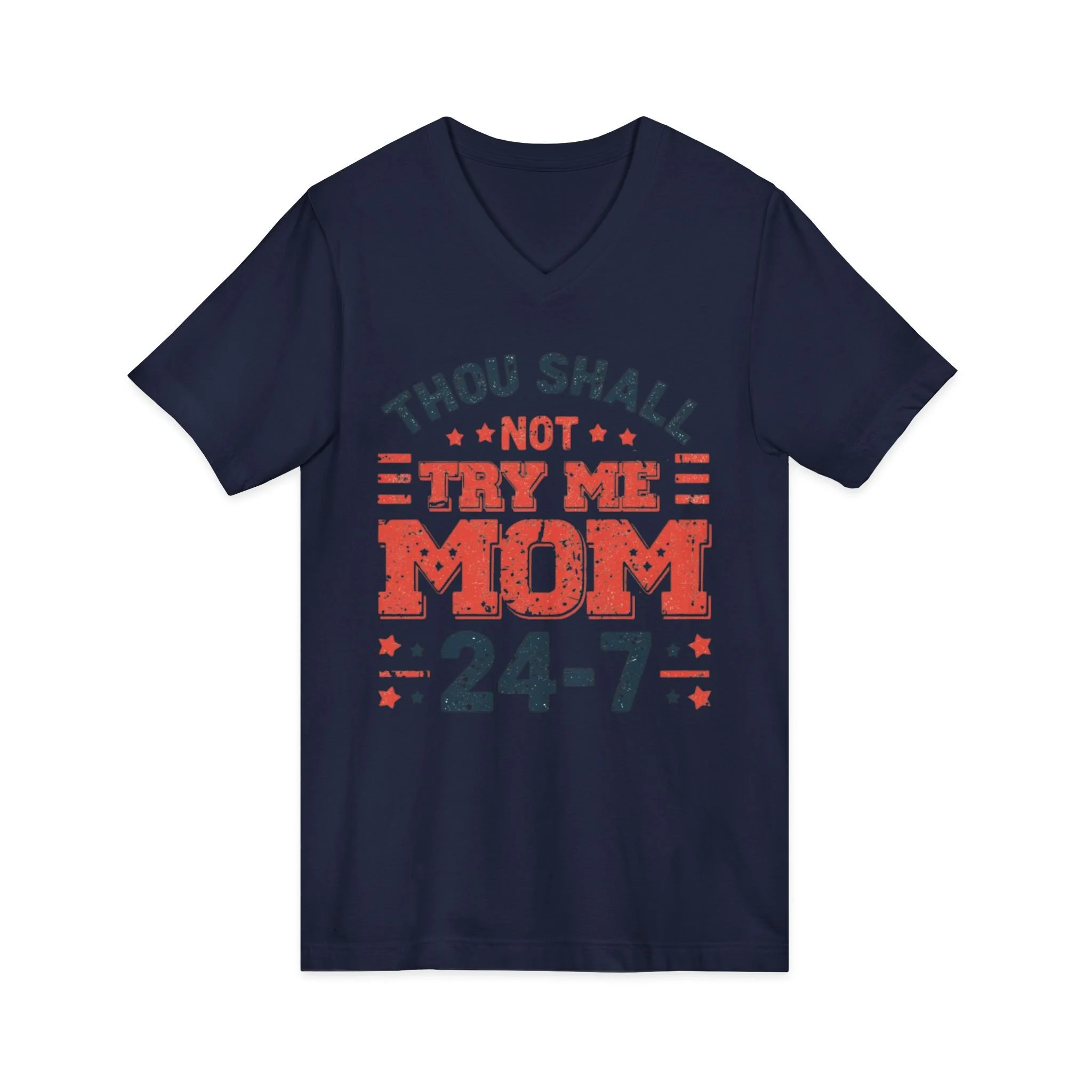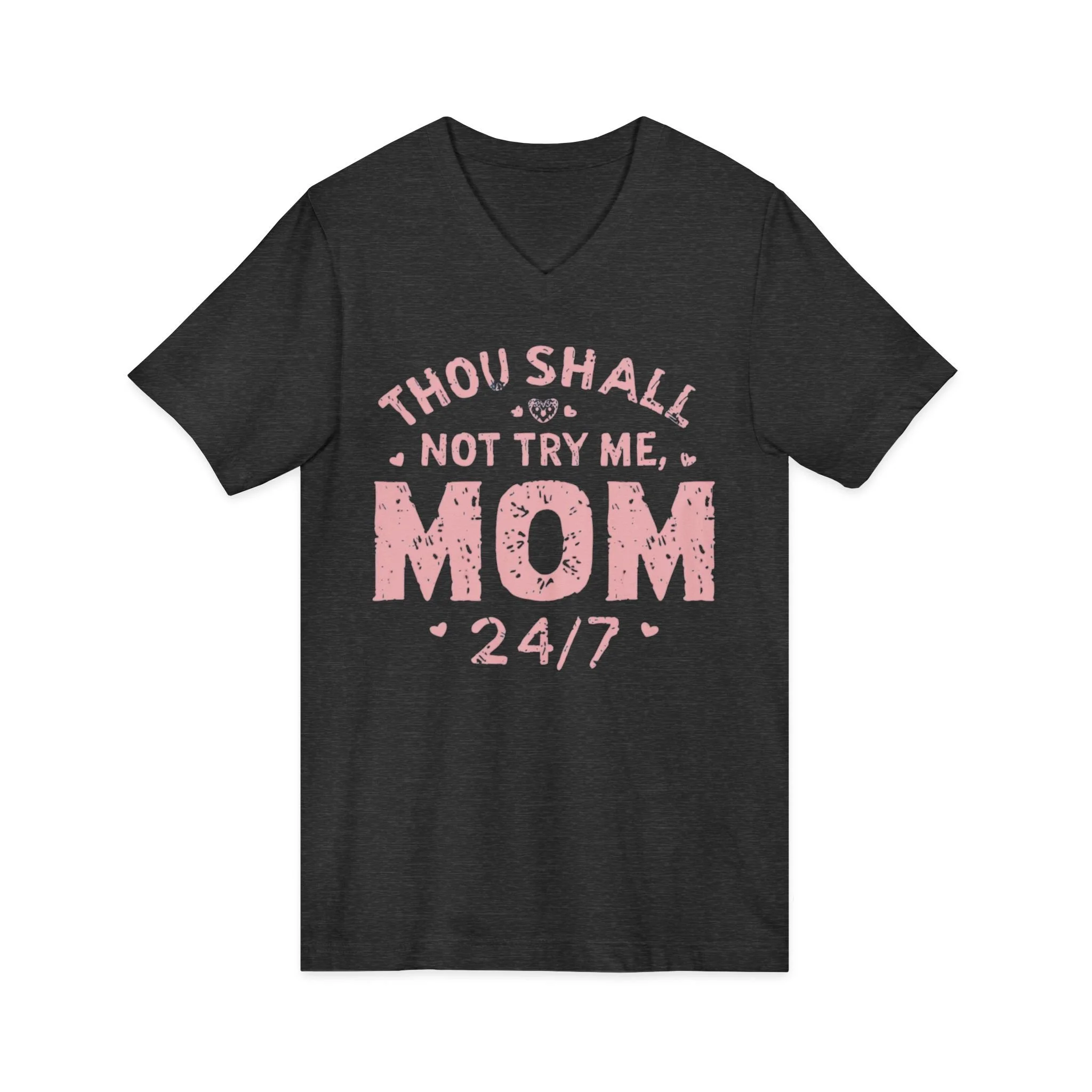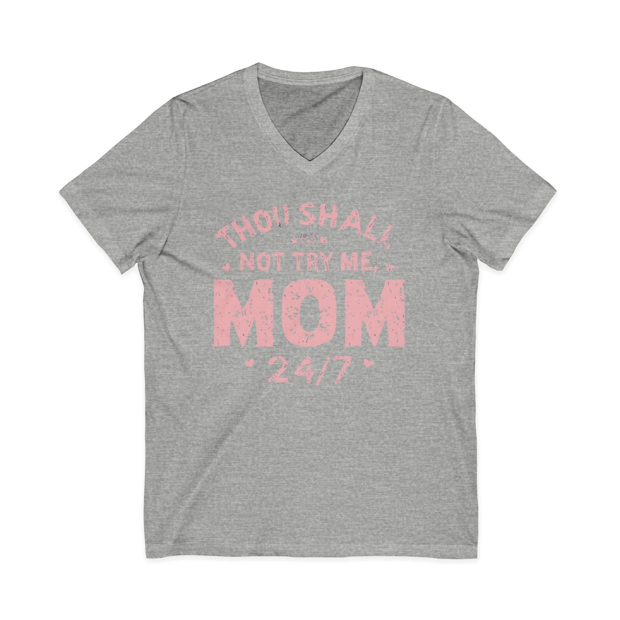 This Unisex Jersey Short Sleeve V-Neck Tee is perfect for the bold and sassy moms out there. The playful design declares "Thou Shall Not Try Me, MOM 24/7," adding a humorous flair to everyday wear. Made from lightweight and breathable fabric, this tee offers a comfortable fit for any season, making it an essential addition to casual outings or relaxed days at home. Ideal for Mother's Day celebrations, family gatherings, or just lounging around, it's a fantastic gift for mothers who appreciate a mix of humor and style in their wardrobe. Its versatile look is suitable for both casual and semi-formal settings, making it a go-to choice for moms who want to express their personality effortlessly.