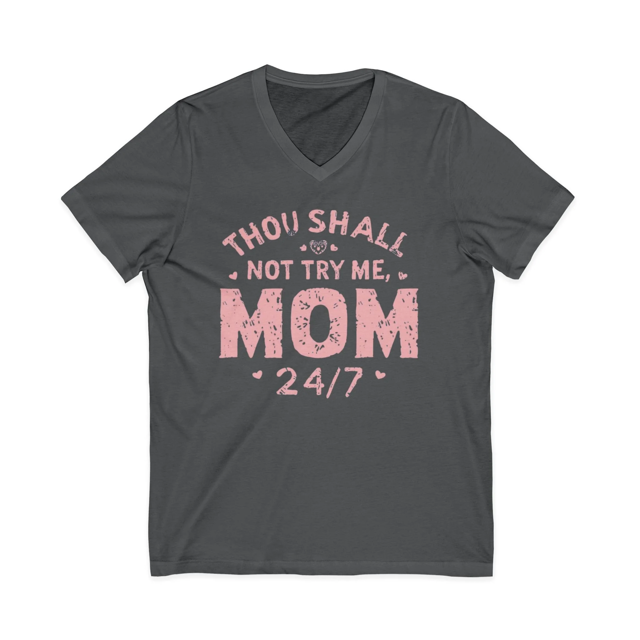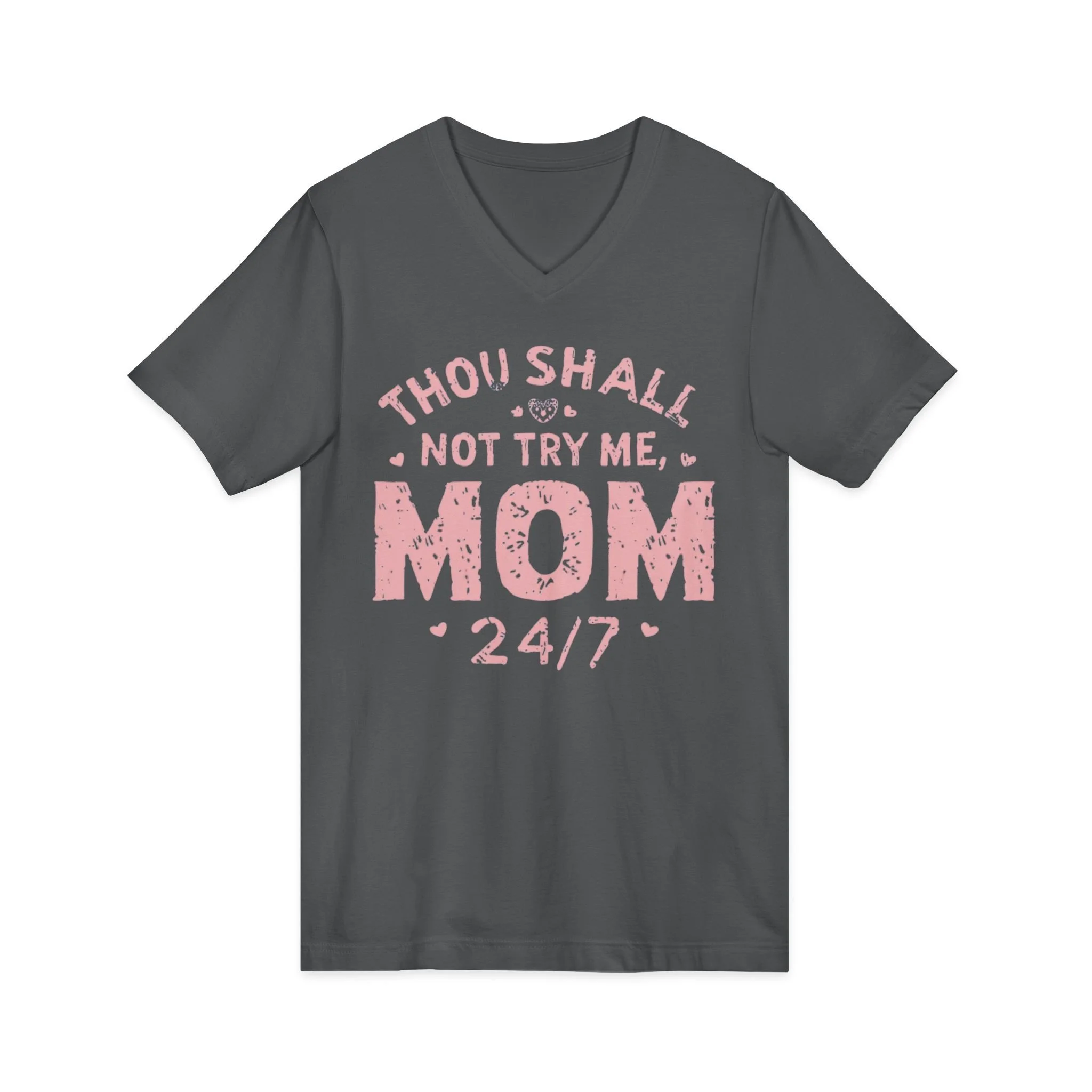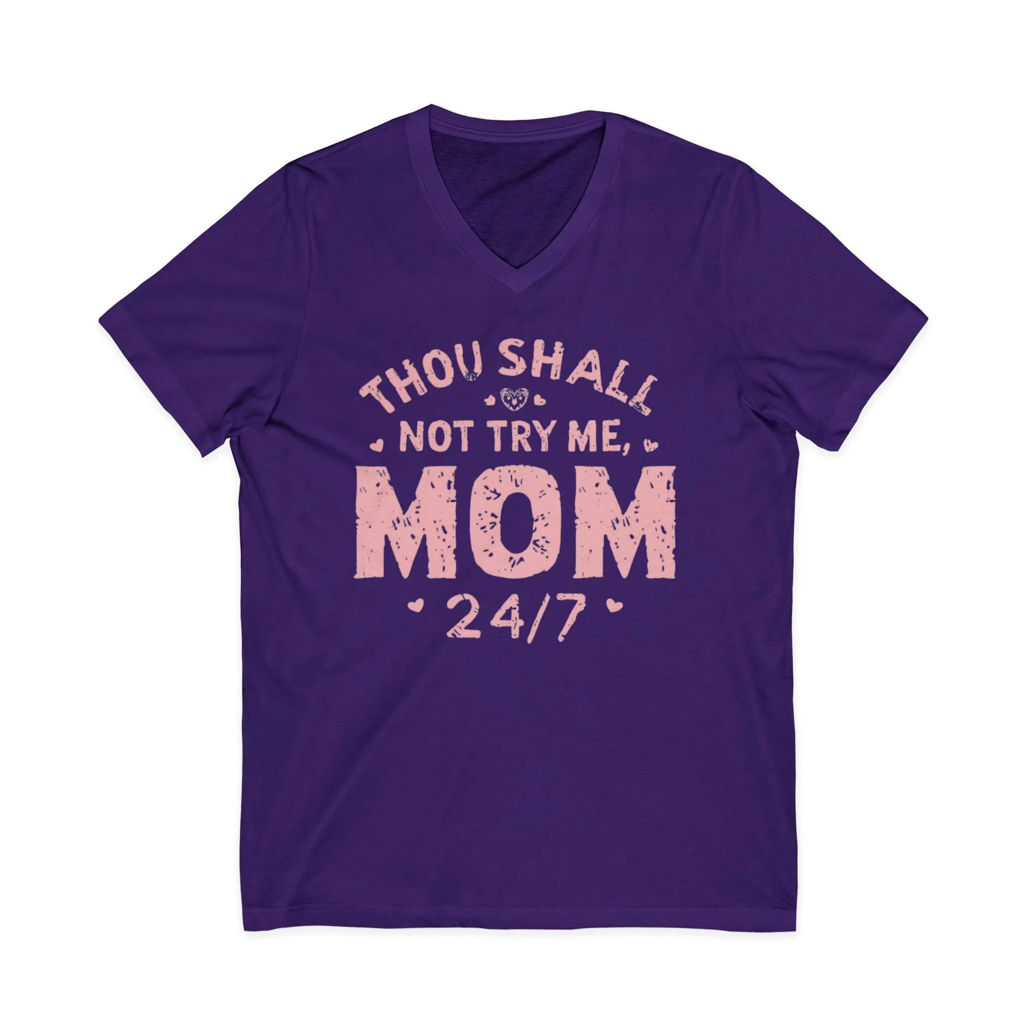 This Unisex Jersey Short Sleeve V-Neck Tee is perfect for the bold and sassy moms out there. The playful design declares "Thou Shall Not Try Me, MOM 24/7," adding a humorous flair to everyday wear. Made from lightweight and breathable fabric, this tee offers a comfortable fit for any season, making it an essential addition to casual outings or relaxed days at home. Ideal for Mother's Day celebrations, family gatherings, or just lounging around, it's a fantastic gift for mothers who appreciate a mix of humor and style in their wardrobe. Its versatile look is suitable for both casual and semi-formal settings, making it a go-to choice for moms who want to express their personality effortlessly.